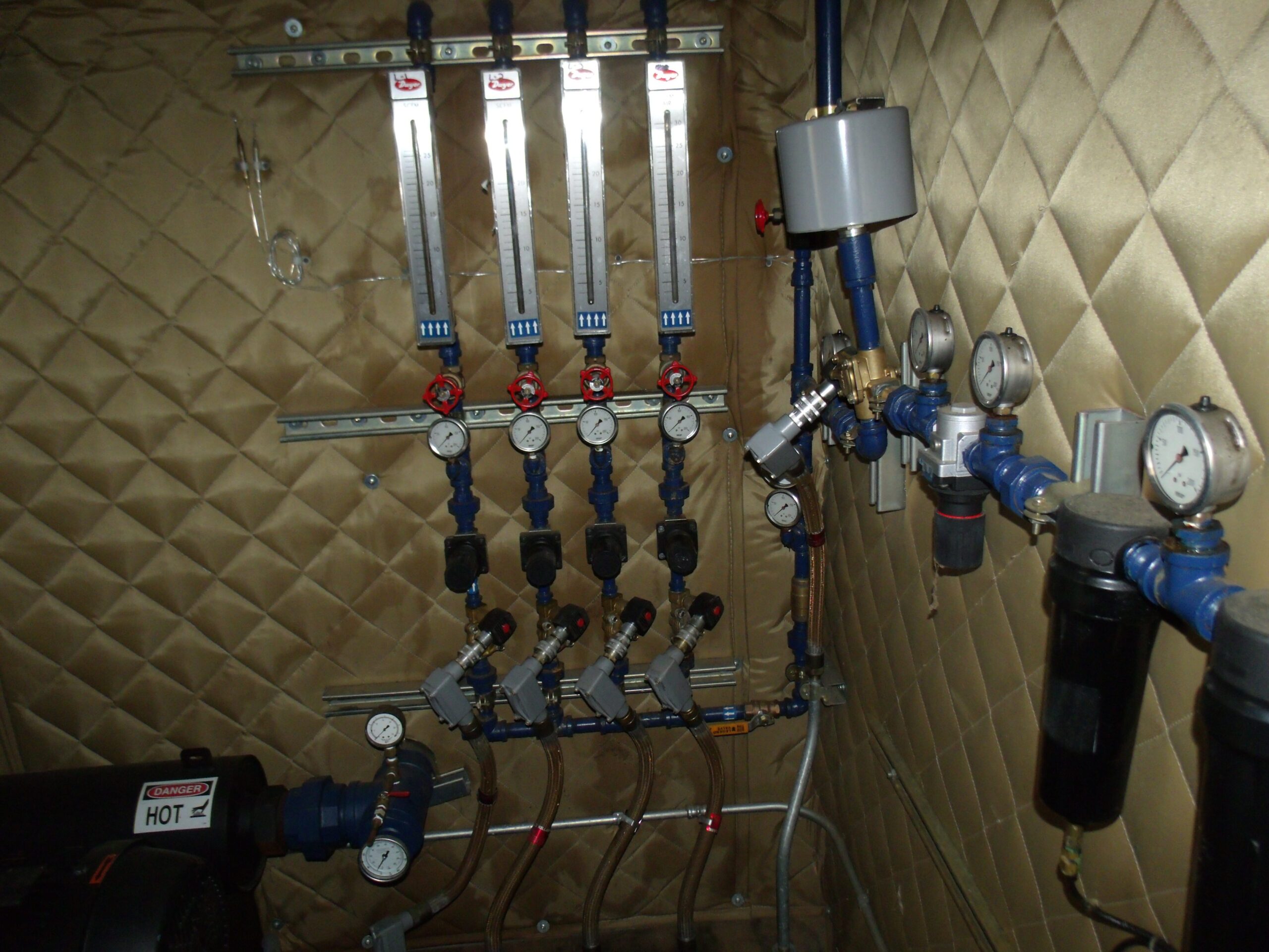 - Sparge Manifold – 4 Dwyer Rate Master flow rate meters 0- 30 SCFM with regulators ASCO solenoids and Pressure Gauges